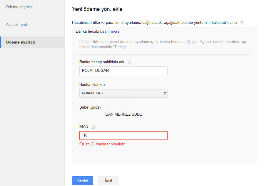 Ben Banka hesap sahibinin adını “polat duğan” olarak girmiştim fakat google hem türkçe karakter kabul etmiyor, hemde banka hesap adınızla sizin google’da bulunan isminizin aynı olmasını istiyor. Soyadımda ” ğ ” olduğu için ” g ” harfini kullanmam gerekliydi. Bende doğal olarak “polat dugan” yazıyordum. Bu yüzden günlerce Google adsense test ödemesi beklediğim oldu. Fakat test ödemesi yine gelmiyordu. Türkçe karakterden problem yaşadığım belliydi. En son ismimin tamamını büyük harflerle yazdım. Aynı yukarıdaki örnek resimde görüldüğü gibi banka ismimi “POLAT DUGAN” olarak girdim. Yeniden birincil ödeme şeklini belirledim. İşin aslı büyük harflerle yazmakmış sanırım ki test ödemem ertesi günün sabahına yattı